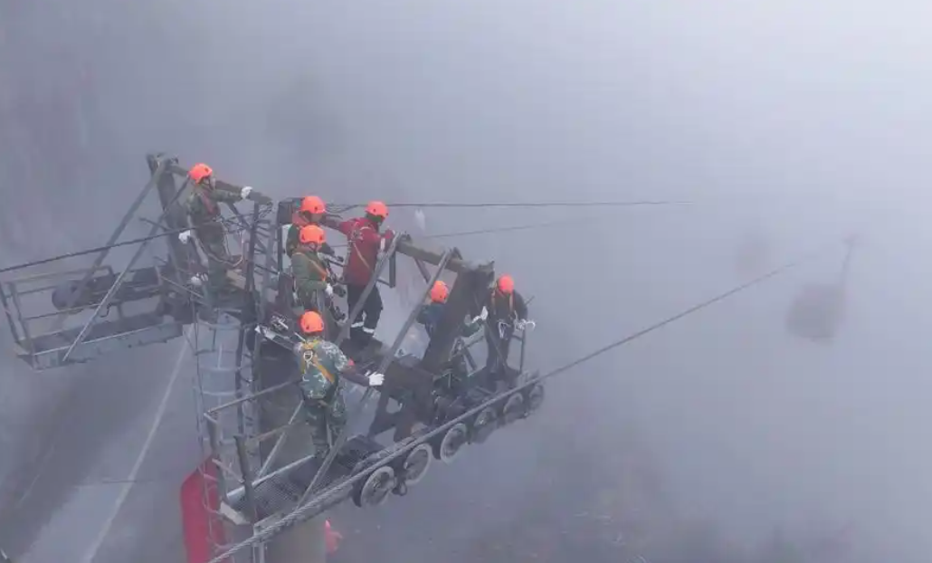 攜帶救援設備的數(shù)名專業(yè)索道救護人員迅速行動,攀上支架,在濃霧中以最快的時間抵達被困轎廂。他們將游客救助至安全地點,地面等候的醫(yī)護人員則第一時間對游客進行救護和安撫工作。